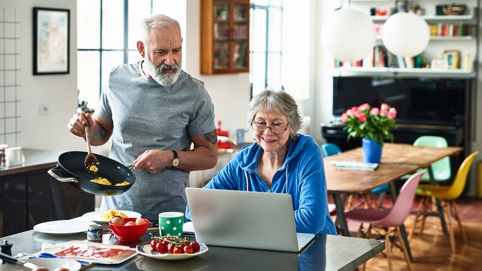 „Ein älteres Ehepaar in der Küche. Die Frau sitzt lächelnd an ihrem Laptop. Der Mann bereitet das Essen zu und schaut ihr interessiert über die Schulter.“