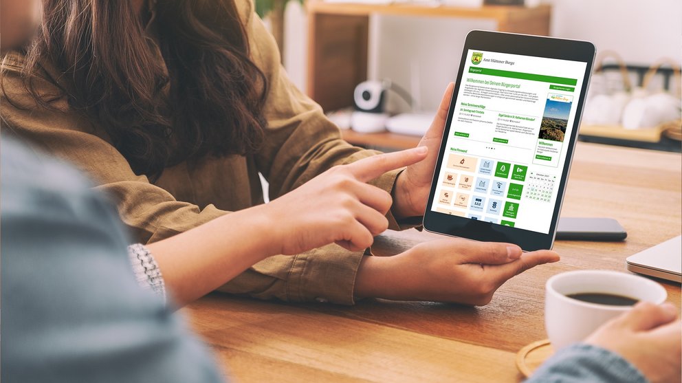 „Bürgerportal Amt Hüttener Berge auf einem Tablet.“