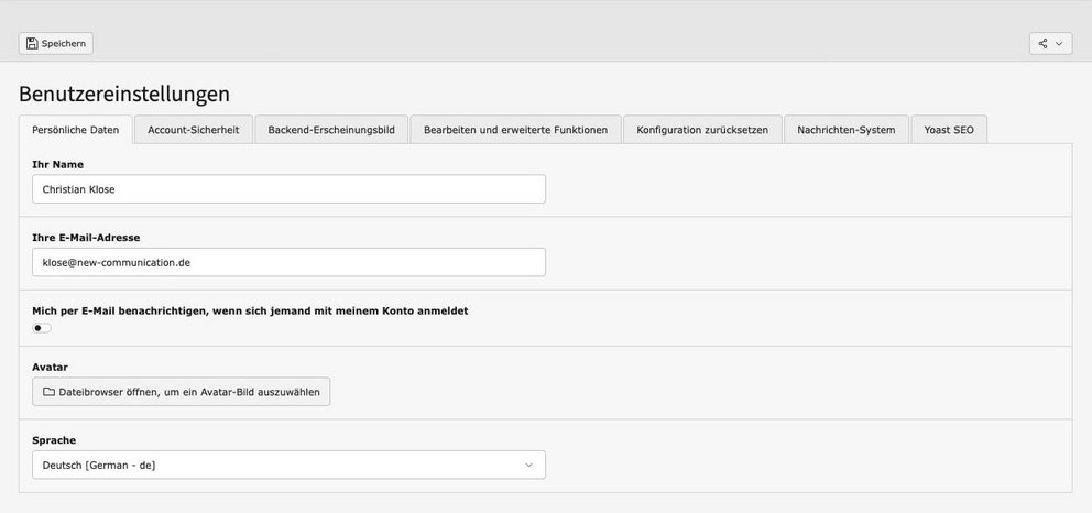 - Sprache (bezieht sich nur auf TYPO3-Backend; auswählbar sind deutsch und englisch)
