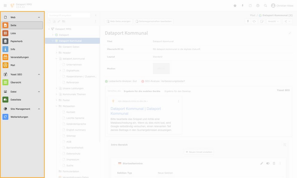 Links im Menü befinden sich unterschiedliche Module zur Darstellung und/oder Verwaltung von Inhalten.
