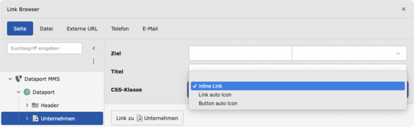 Standardmäßig sind Links als „Inline Link“ gestylt. Das heißt, sie sind im Fließtext integriert und sind unterstrichen. Hier ein Beispiel für einen Inline Link. Über das Select „CSS-Klasse“ kann die Darstellung aber auch geändert werden.