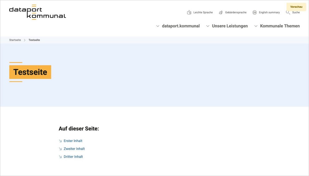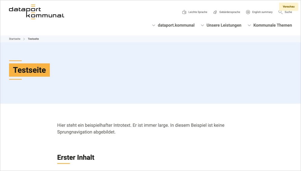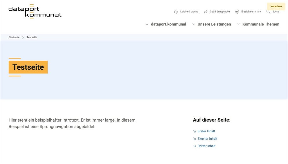 In diesem Beispiel wurde Introtext gepflegt. Die Sprungnavigation wird auch angezeigt, weil Inhaltselemente gepflegt wurden, die in Menüs gezeigt werden sollen und weil das Layout „Standard“ gewählt wurde.