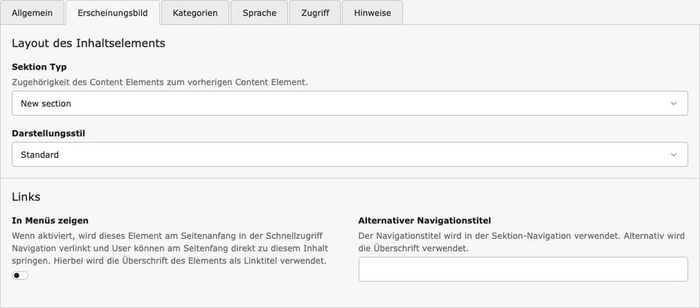 Hier sind je nach Inhaltselement verschiedene Einstellungsmöglichkeiten vorhanden.