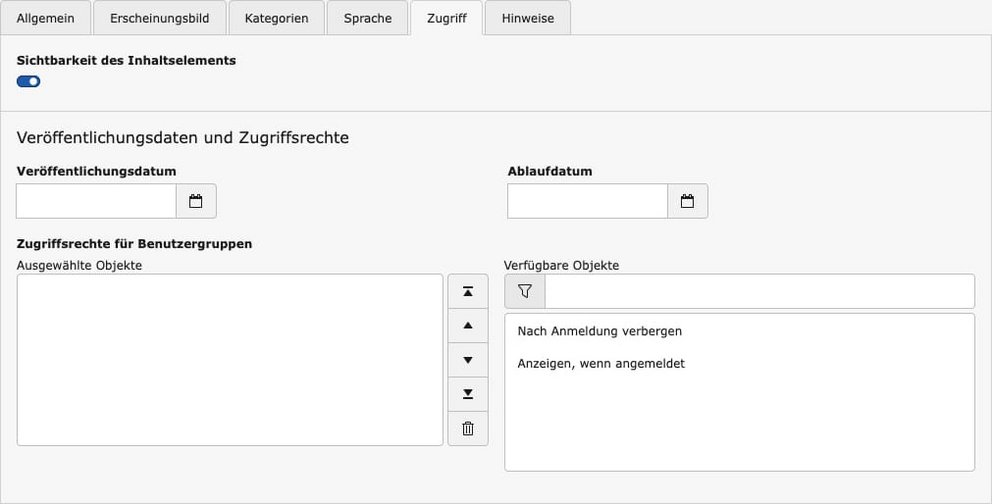 Hier kann das Inhaltselement zeitlich begrenzt werden. So können Elemente gepflegt werden, werden aber erst ab dem festgelegten Datum sichtbar oder unsichtbar.