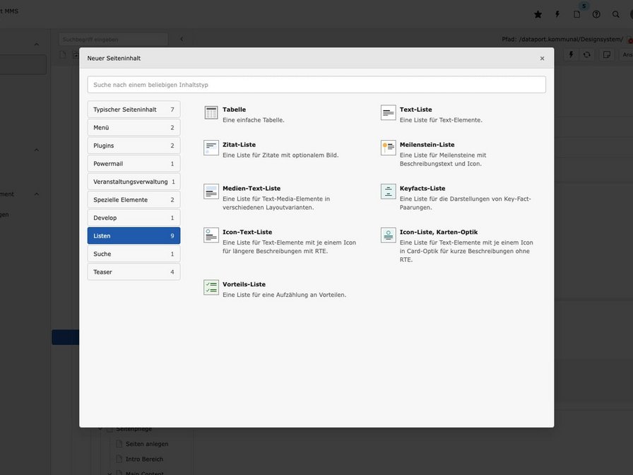 Eine Liste für Text-Elemente mit je einem Icon für längere Beschreibungen mit RTE.