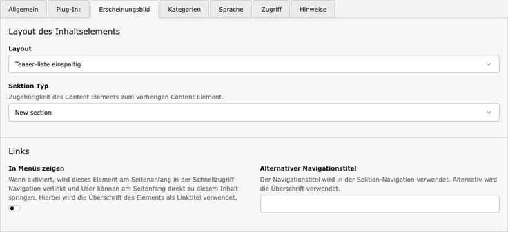- Im Feld „Einleitungstext“ kann ein Textabsatz zwischen Überschrift und Teaserliste eingepflegt werden.