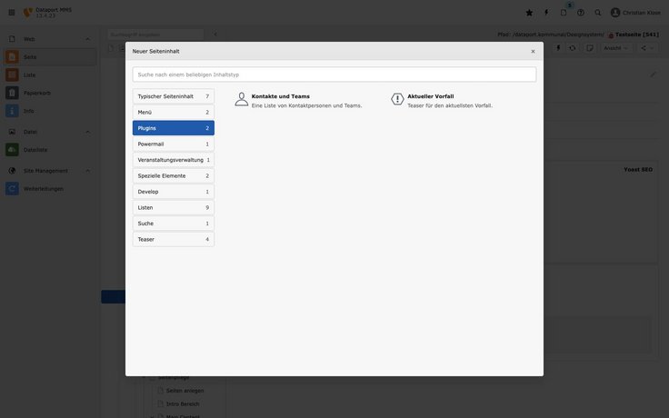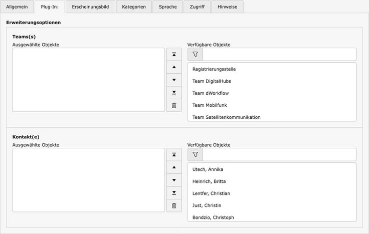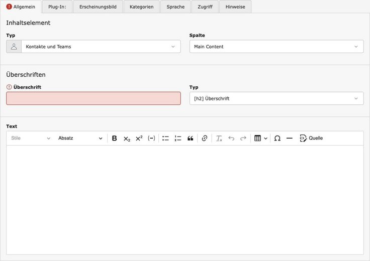 Wählen Sie im Popup „Neuer Seiteninhalt“ den Reiter „Plugins“ an und dort das Element „Kontakte und Teams“.