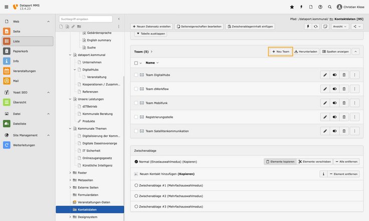 - In der Liste „Team“ über den Button „Neu Kontakt“ einen neuen Datensatz erstellen.