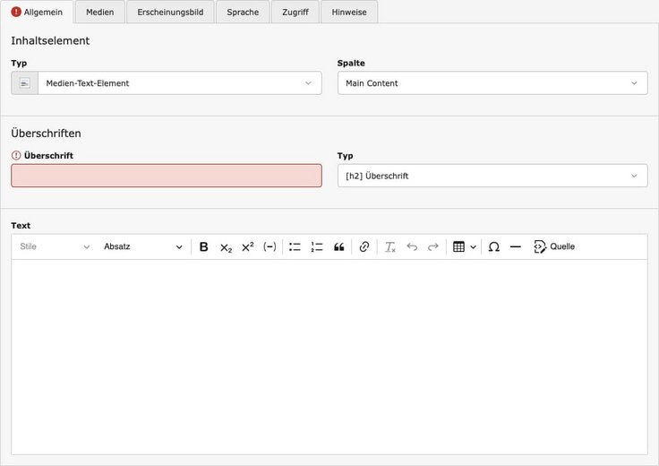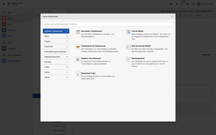 Wählen Sie im Popup „Neuer Seiteninhalt“ den Reiter „Typischer Seiteninhalt“ an und dort das Element „Medien-Text-Element“.
