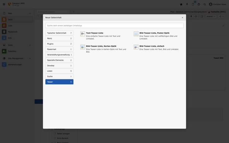 Wählen Sie im Popup „Neuer Seiteninhalt“ den Reiter „Teaser“ an und dort das gewünschte Teaser-Element. Zur Verfügung stehen: