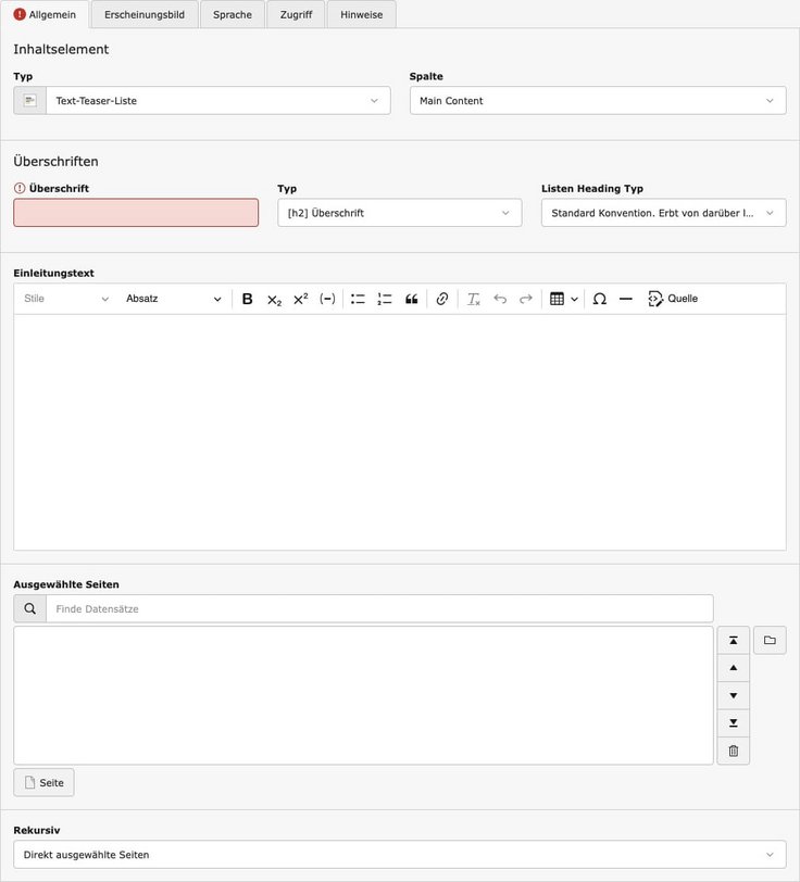 - Im Feld „Einleitungstext“ kann ein Textabsatz zwischen Überschrift und Teaserliste eingepflegt werden.