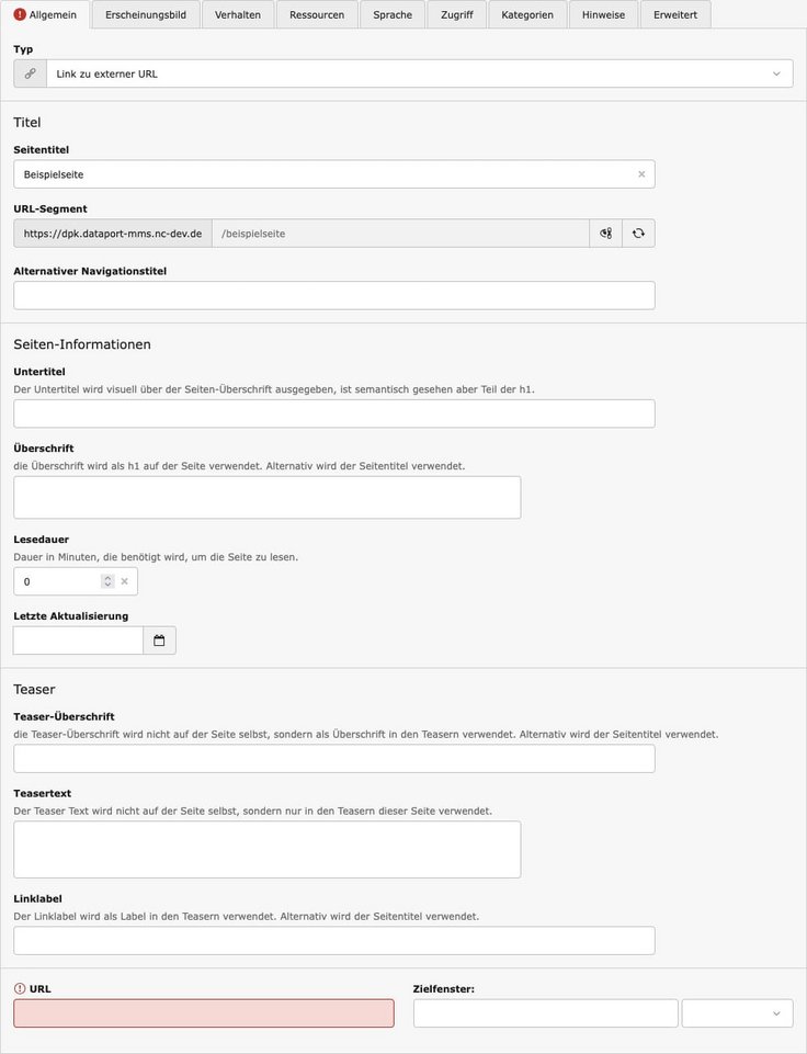 Auch externe Seiten können angeteasert werden. Dafür muss zunächst jedoch eine Seite angelegt werden, die ein Verweis auf eine externe URL ist. Führen Sie folgende Schritte durch: