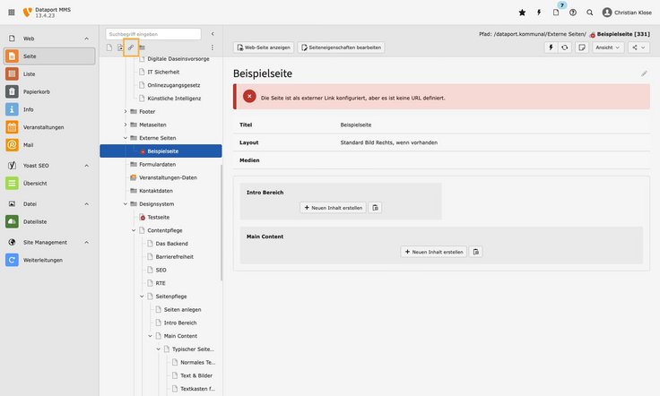 - Ziehen Sie dazu das Seitensymbol „Link zu externer URL“ per Drag and Drop einfach in den Ordner „Externe Seiten“.